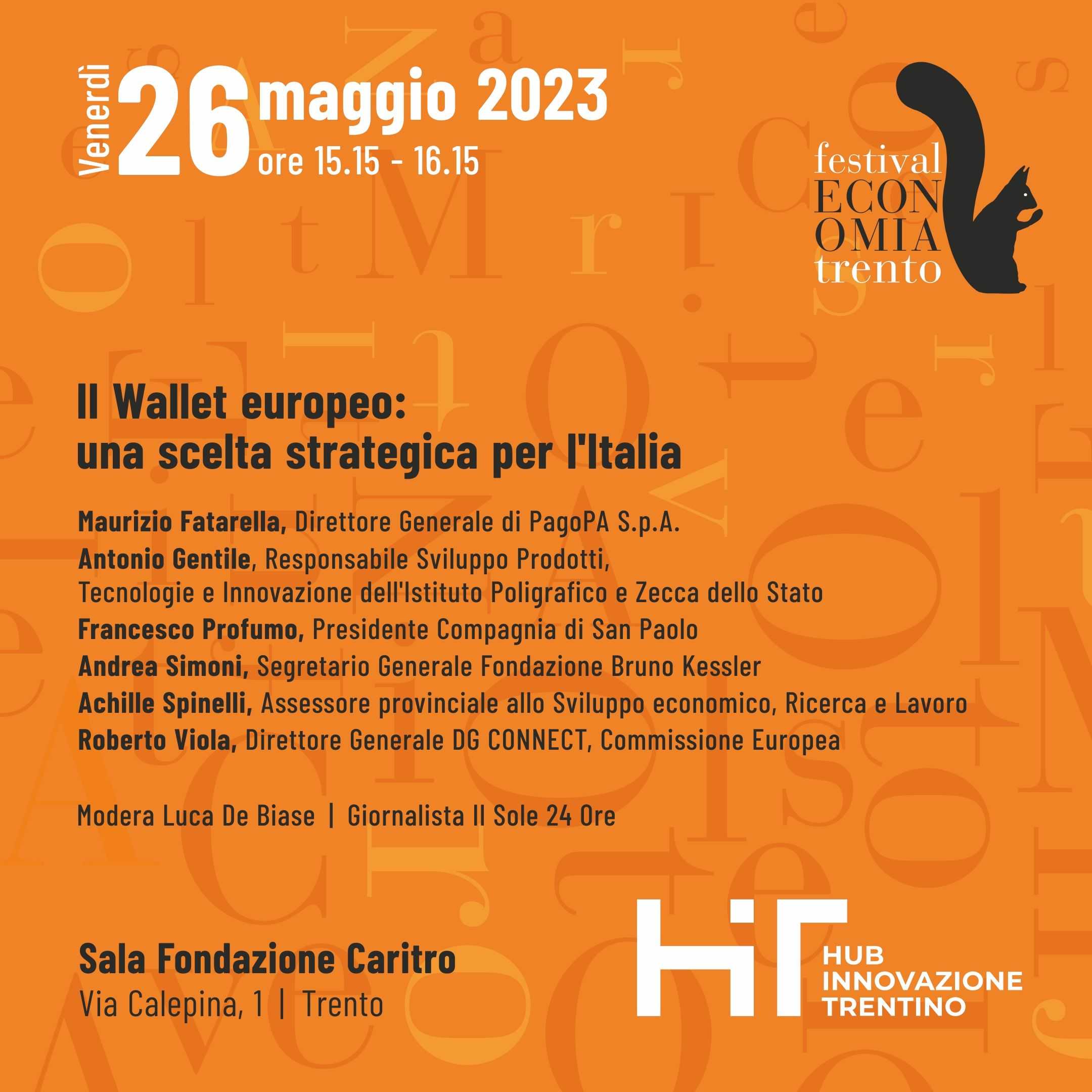 Il panel, dal titolo “Il wallet europeo: una scelta strategica per l’Italia”, è previsto nell’ambito del programma “Economie dei territori” con la moderazione del giornalista de Il Sole 24 Ore Luca De Biase. Al dibattito prenderanno parte: l’Assessore provinciale Achille Spinelli, il direttore generale della DG CONNECT presso la Commissione Europea Roberto Viola, il Direttore Generale di PagoPA S.p.A. Maurizio Fatarella, il presidente della Compagnia di San Paolo Francesco Profumo e il Segretario Generale di Fondazione Bruno Kessler Andrea Simoni.